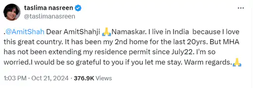 तसलीमा नसरीन ने सोशल मीडिया पर साझा पोस्ट में लिखा कि ‘मेरा भारतीय रेजीडेंस परमिट जुलाई में एक्सपायर हो गया है, लेकिन गृह मंत्रालय उसे रिन्यू नहीं कर रहा है।’ तसलीमा नसरीन ने लिखा कि ‘भारत मेरा दूसरा घर है और 22 जुलाई के बाद से परमिट रिन्यू न होने से मैं परेशान हूं। अगर सरकार मुझे भारत में रहने देगी तो मैं शुक्रगुजार रहूंगी।’ अब जैसे ही गृह मंत्रालय ने बांग्लादेशी लेखिका का निवास परमिट बढ़ाया तो उन्होंने सोशल मीडिया पर पोस्ट लिखकर गृह मंत्री अमित शाह को धन्यवाद दिया।