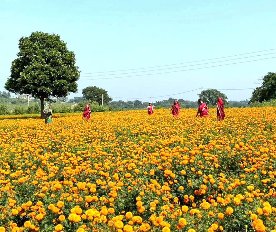 मुख्यमंत्री श्री हेमंत सोरेन के प्रयास से झारखण्ड में स्वरोजगार की ओर अग्रसर माहिलाएं। खूंटी के विभिन्न प्रखंडों में सखी मंडलों के लगभग 260 एकड़ भूमि पर गेंदा के फूल लहलहा रहे हैं। त्योहारी सीजन में फूलों की मांग बढ़ने से ग्रामीण महिलाओं का हौंसला बढ़ा है। महिलाएं फूल की माला बनाकर उचित मूल्य में बिक्री कर रही हैं।