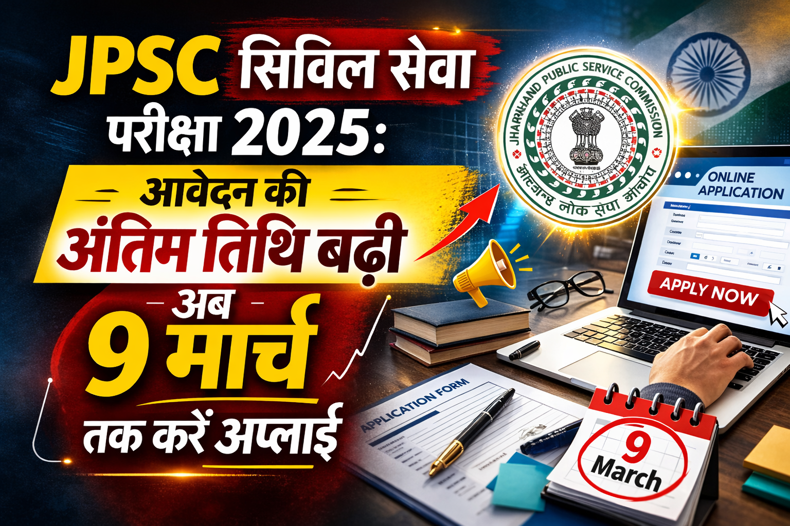 रांची: झारखंड लोक सेवा आयोग (JPSC) ने संयुक्त असैनिक सेवा (सिविल सेवा) प्रारंभिक प्रतियोगिता परीक्षा 2025 के लिए आवेदन की अंतिम तिथि बढ़ा दी है। अब अभ्यर्थी 9 मार्च 2026 तक ऑनलाइन आवेदन कर सकते हैं । यह फैसला आयोग ने आयु सीमा को लेकर बदले गए नियमों के बाद लिया है, जिससे बड़ी संख्या में अभ्यर्थियों को राहत मिली है ।