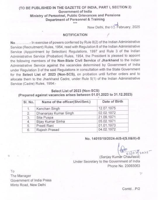 रांचीः झारखंड के छह नॉन स्टेट सिविल सर्विस के अधिकारियों के लिए खुशखबरी है. इनको भारतीय प्रशासनिक सेवा के तहत झारखंड कैडर में प्रोन्नति मिली है. केंद्र सरकार के कार्मिक मंत्रालय ने इस बाबत अधिसूचना जारी कर दी है. साल 2023 की रिक्तियों के विरुद्ध इन सभी को प्रोन्नति मिली है. इनमें कंचन सिंह, धनंजय कुमार सिंह, सीता पुष्पा, बिजय कुमार सिन्हा, प्रीति रानी और राजेश प्रसाद के नाम शामिल हैं.